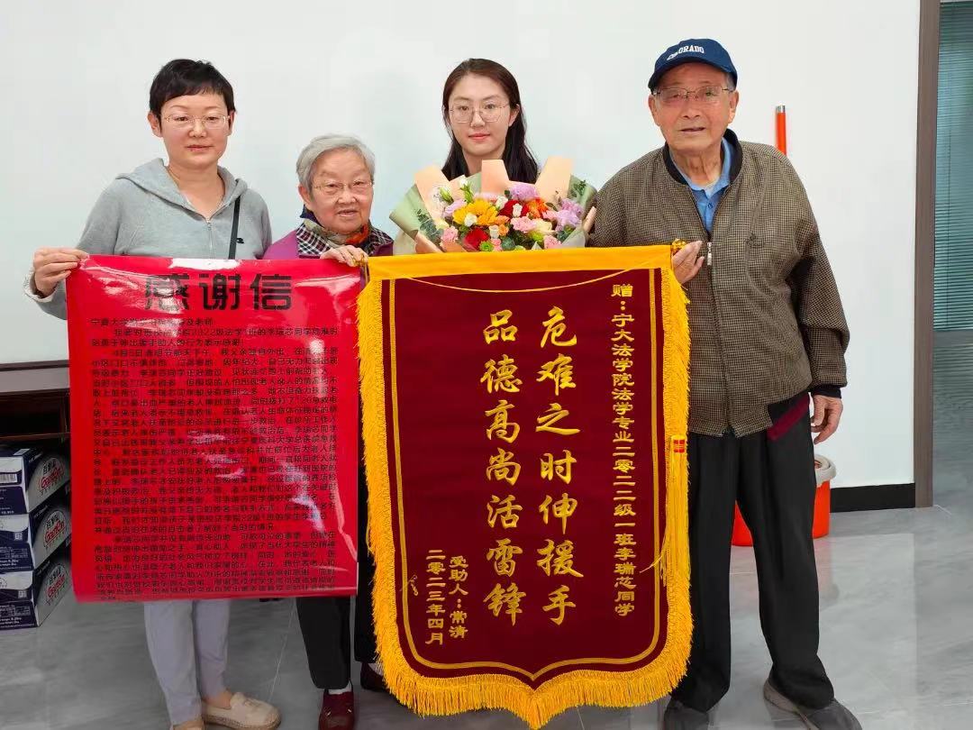 2023-05-09近日,勤学书院2022级法学专业本科生李瑞芯在返校途中热心救助一位摔伤老人,为表示感谢,老人携家属来院赠送锦旗及感谢信。4月5日下午,李瑞芯在兴庆区清苑丰景小区门口发现一老人摔倒趴卧在地,她赶紧上前查看、了解伤者情况。“我看到老爷爷脸着地摔在小区门口就赶紧过去看,发现他脸部受伤严重,血流不止,呼吸费力。当时也没多考虑什么,就想着救人要紧。”李瑞芯简单描述了当时的场景。随后她一边帮老人擦拭血迹,一边拨...