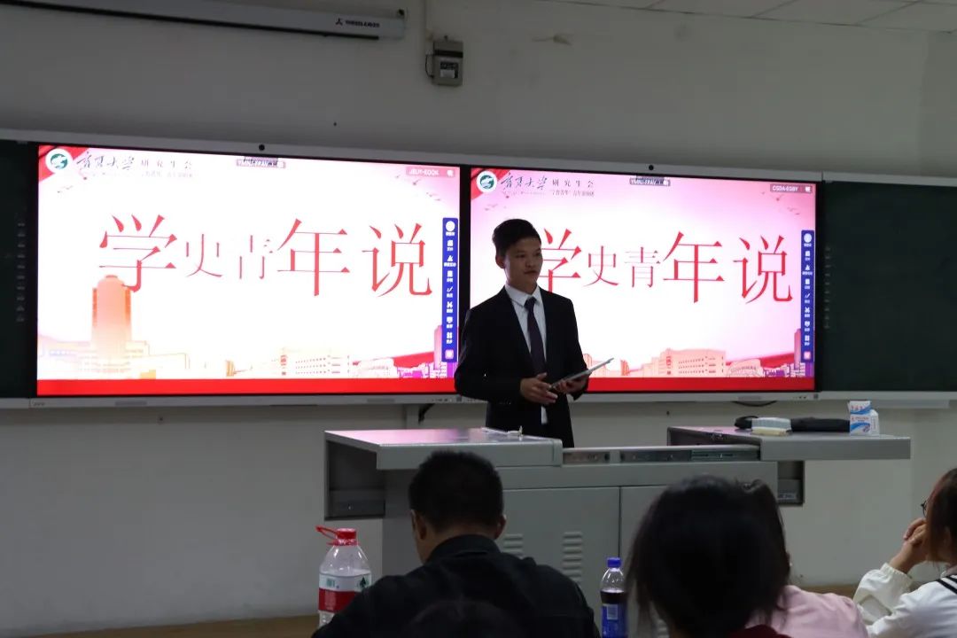 青年讲师团成员朱浩亮和孔维奥以幽默风趣的话语,向大家讲述了宁夏大学的历史。他们以校史为载体,分享了宁夏大学建校以来的艰辛历程,以及从中孕育出的“沙枣树精神”。党史、团史融入在校史中,让新生们更好地认识宁大、了解宁大,促进新生能够深刻认识到自己肩负的使命,树立正确的价值观念,牢记初心与使命,用汗水践行沙枣树精神,浇灌一棵棵茁壮成长的“沙枣树”。