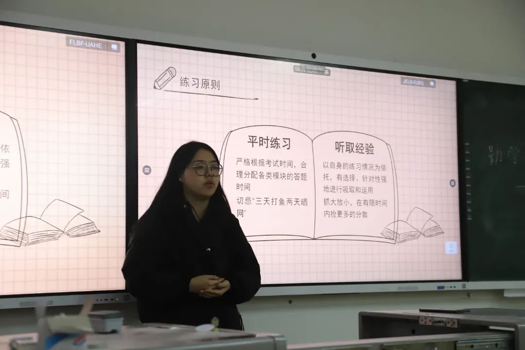 分享经验的同学从自身经验出发,首先强调了制定有效学习计划的重要性。合理分配时间,做到事半功倍。结合大家的实际情况,步步深入、直击四六级考试重心。从备考策略到写作、翻译、听力、阅读,多方面、多层次、多角度,覆盖全题型的讲解为同学们吃下了一颗“定心丸”。