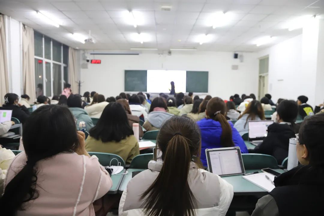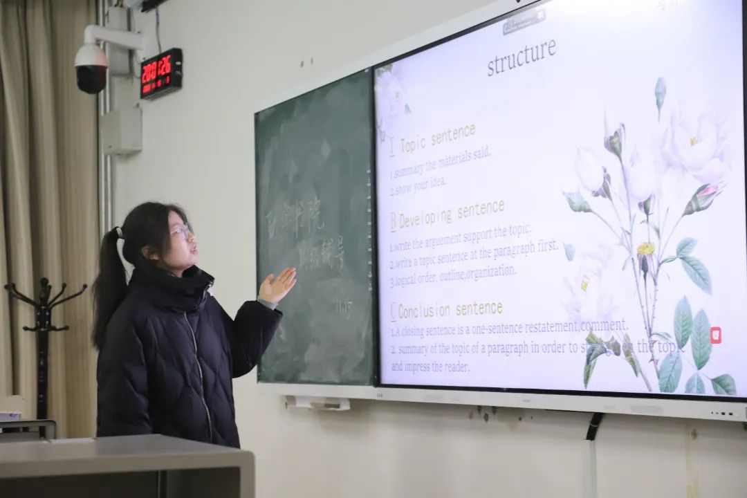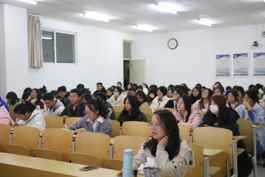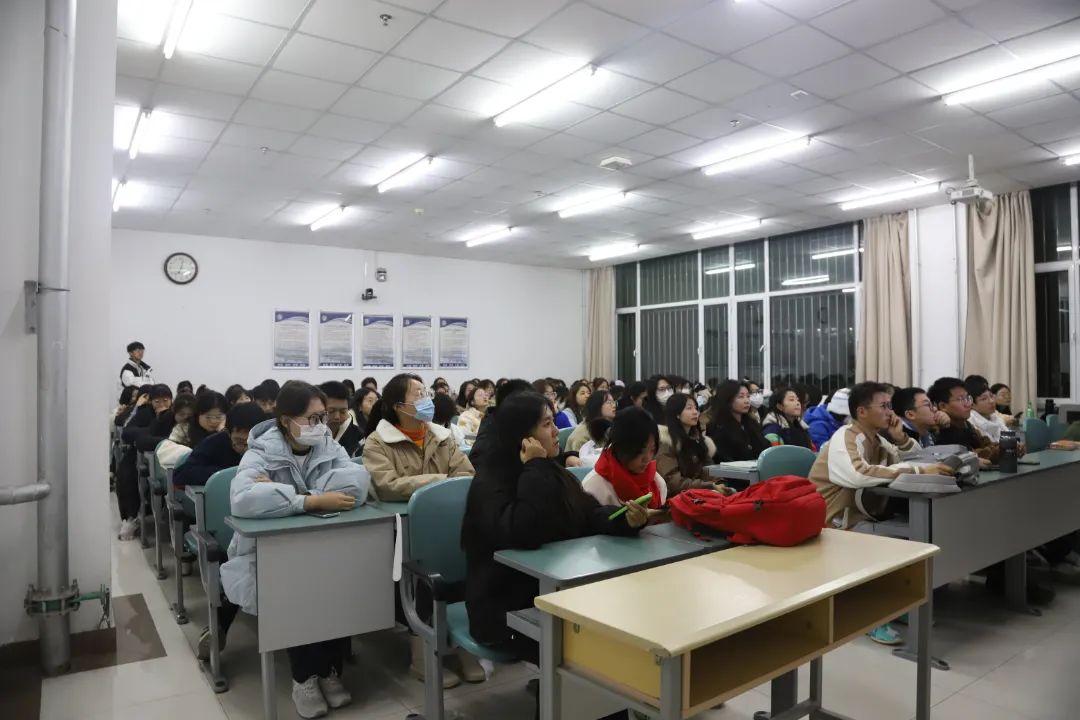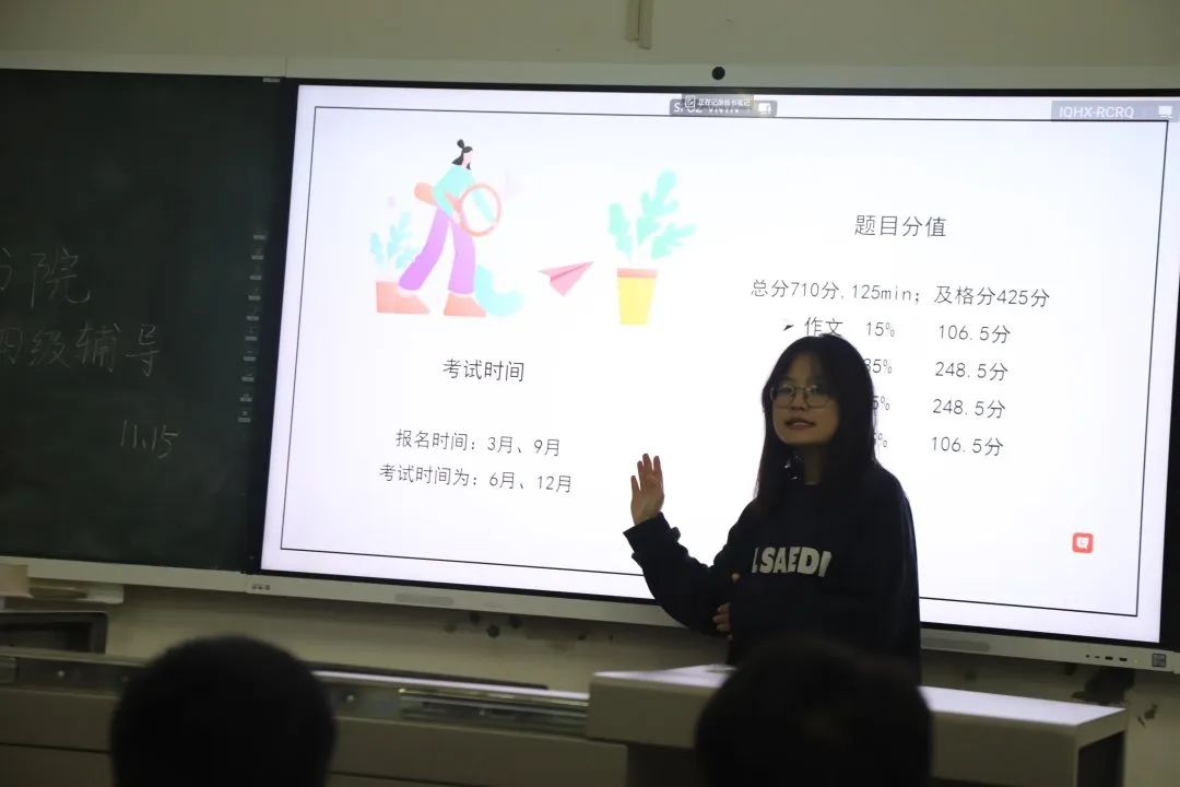 通过对真题的分析,他们强调了语法和词汇积累的重要性。在对往年整理归纳和学习练习中,共同探寻出题规律。单词渐渐布满黑板,同学们沉浸在这场分享会中感受到身体渐渐被知识盈满的填充感。此刻,大家不仅获得了攻克四六级的知识技巧,更感受到英语知识的魅力。