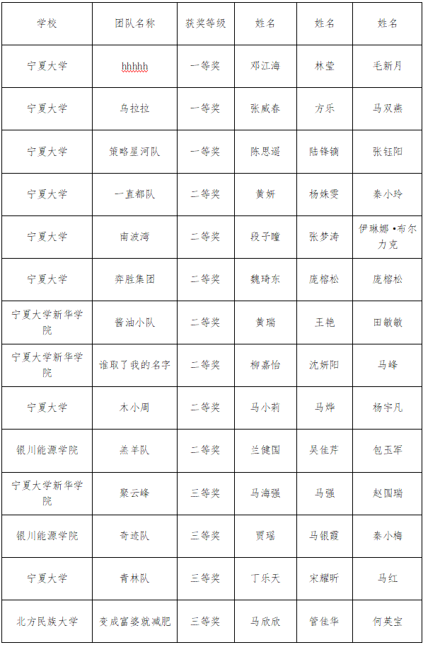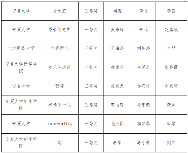 经过最后综合评分,我校3支队伍获得一等奖,4支队伍获得二等奖,5支队伍获得三等奖;宁夏大学新华学院2支队伍获得二等奖,4支队伍获得三等奖;北方民族大学2支队伍获得三等奖;银川能源学院1支队伍获得二等奖,1支队伍获得三等奖。