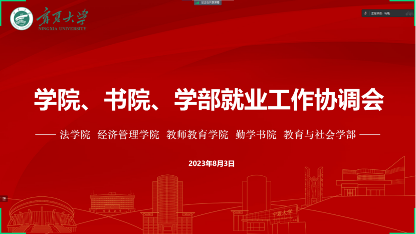 为了进一步推动2023届毕业生就业工作进展,抢抓“百日冲刺”专项行动关键时期,促进毕业生高质量充分就业,学院、书院、学部就业工作协调会于8月3日通过线上会议方式进行。勤学书院党委书记兼院长马瑜、法学院党总支书记李治涛、经济管理学院党总支书记赵军、教师教育学院党总支书记拜发奎、法学院党总支副书记刘振宇、教师教育学院党总支副书记焦岩岩、教育与社会学部党委副书记房彦兵、勤学书院副院长常江、学生就业指导中心主任贺剑、综合办公室主任王嘉豫、辅导员王文浩、艾萨·阿尤普、付晓晨参加会议,会议由马瑜主持。