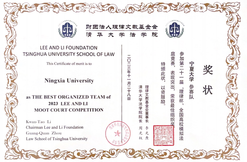 2023年11月24日至28日,由清华大学法学院主办,理律文教基金会协办的第二十一届“理律杯”全国高校模拟法庭竞赛在清华大学法学院成功举行。本次竞赛共有40所高校代表队参加,邀请了众多实务界和学术界的专家担任评委,以“新业态和平台经济下的民事纠纷”为模拟案件,围绕当前司法实务中的关键问题和争议焦点展开研讨与辩论。来自全国各地的40所法学院校代表队在这场法律盛宴中,用精彩的表现为公众展示了卓越的法律才华。宁夏大学代表队由勤学书院法学专业本科生组成,法学院教师张驰担任教练,教师张弛担任领队。经过激烈角逐,秦子禄同学获得宁夏大学代表队“最佳辩手”,宁夏大学代表队与作为主办方的清华大学队分获“最佳组织奖”。