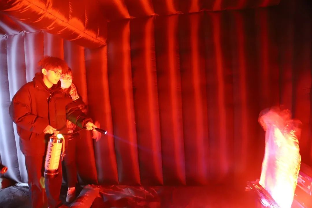 本次培训共分两个部分:一是灭火演练。现场培训人员向师生们详细介绍了便携式仿真电子灭火器的使用方法。随后,师生有序进入灭火体验馆,拿起灭火器、拔掉保险销,站到离火焰两到三米处,一手提灭火器,一手握软管对准火焰根部,按压握把左右进行扫射,直至火焰熄灭。
