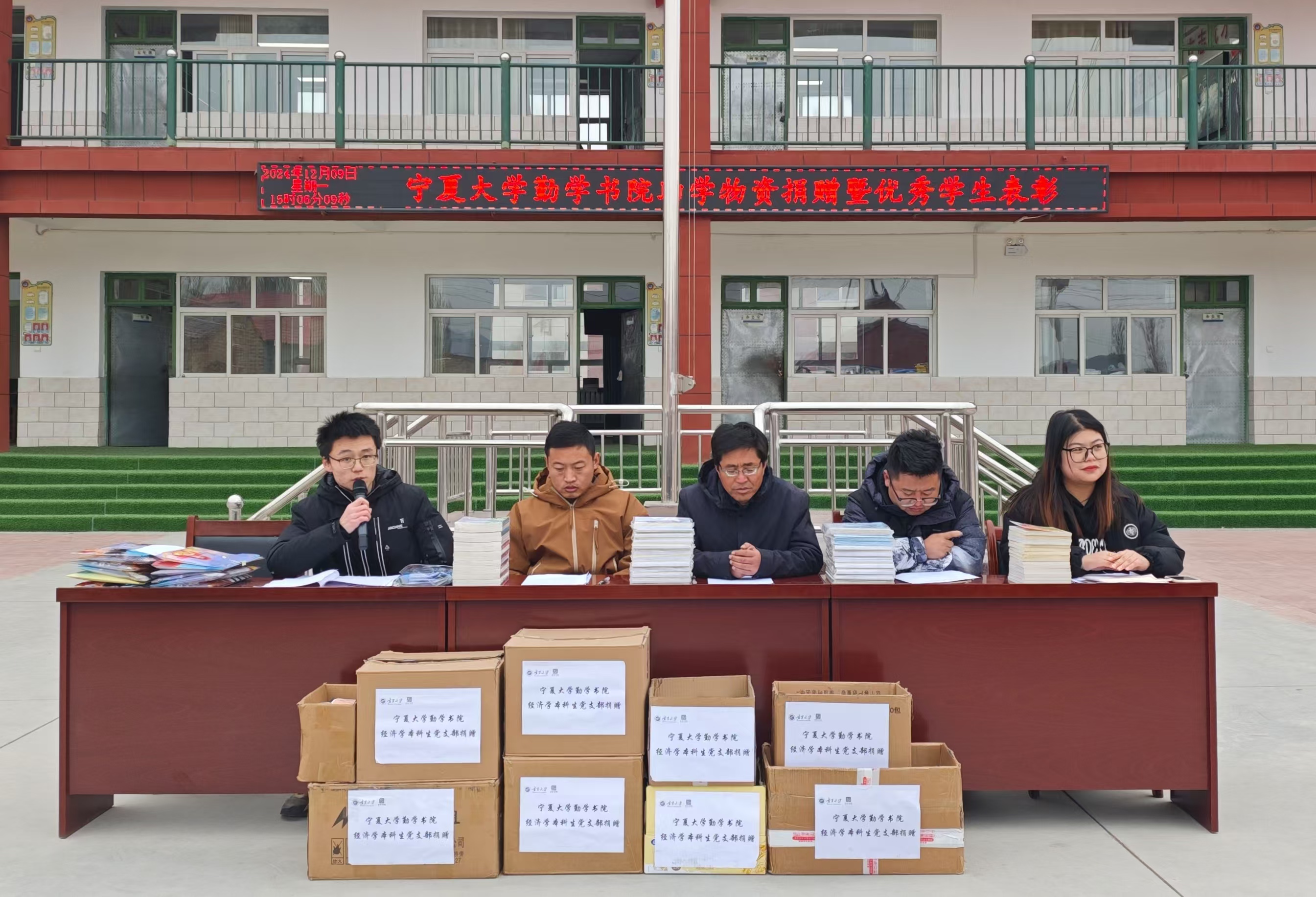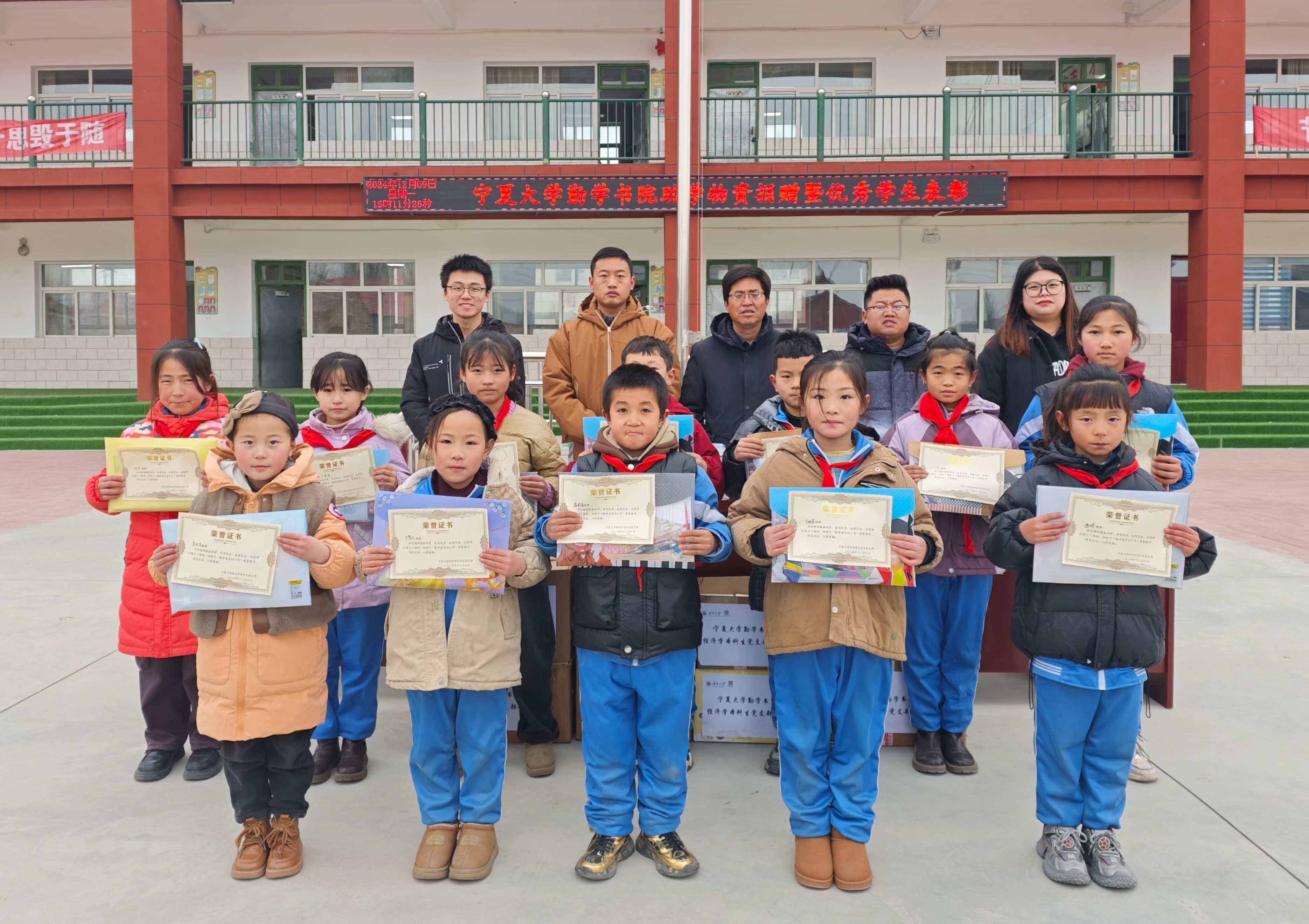 为全面贯彻党的教育方针,落实立德树人根本任务,促进学生全面发展,营造良好的校园文化环境与学习氛围,12月9日下午,勤学书院联合宁夏大学“振兴乡村教育”研究生支教团在固原市原州区炭山乡南坪小学举办“勤学善思 筑梦远航”助学物资捐赠暨优秀学生表彰仪式。南坪小学全体师生参加活动。