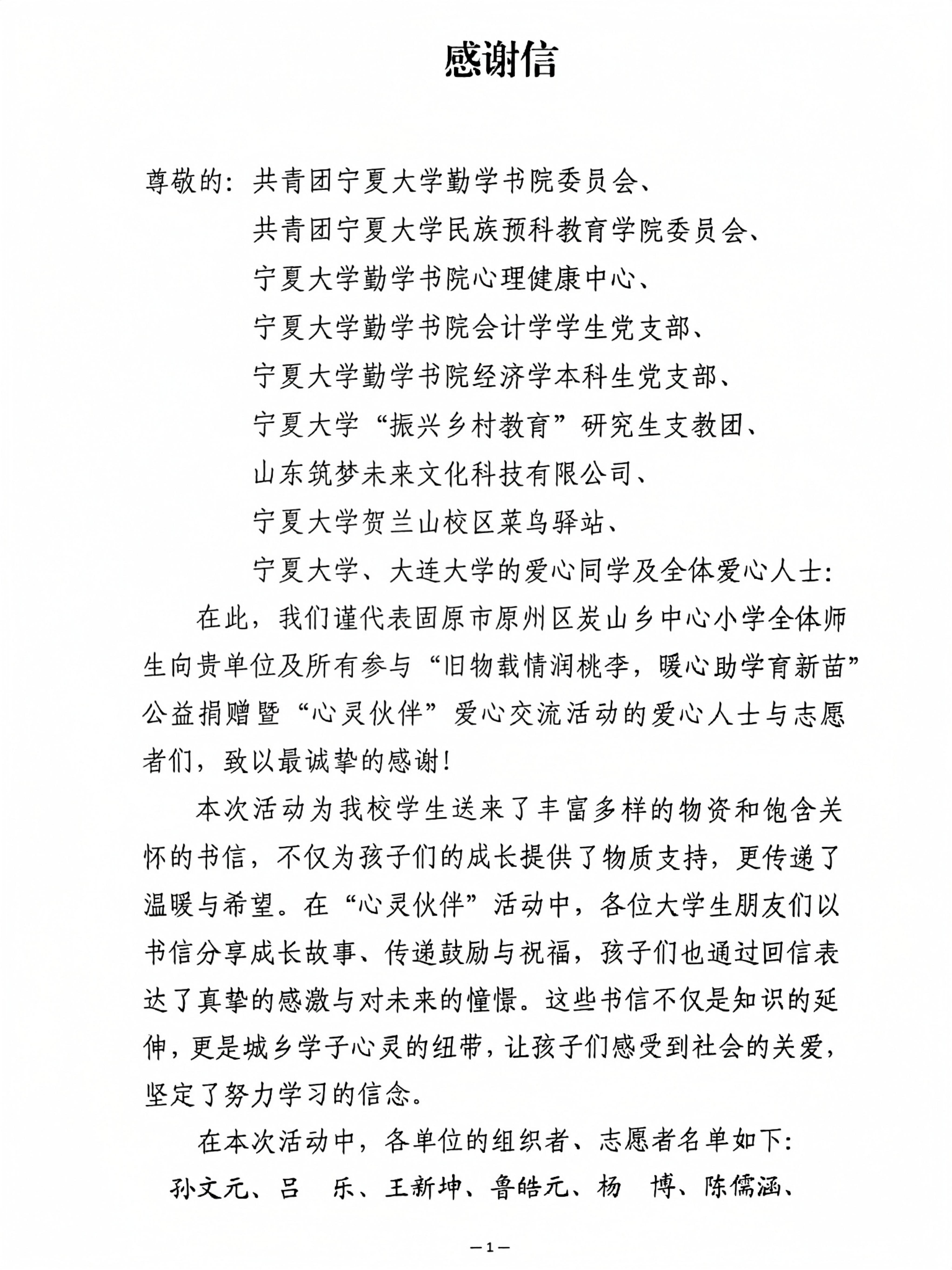 为助力乡村教育事业发展,为乡村儿童送去关爱与温暖,搭建城乡学子心灵沟通的桥梁,传递知识与爱的力量,勤学书院公益捐赠暨“心灵伙伴”书信交流活动圆满落幕。本次活动由共青团新葡的京集团3522委员会、中共固原市原州区炭山乡中心小学支部委员会、共青团宁夏大学民族预科教育学院委员会、勤学书院心理健康中心、经济学本科生党支部、会计学学生党支部、宁夏大学“振兴乡村教育”研究生支教团、山东筑梦未来文化科技有限公司、宁夏大学贺兰山校区菜鸟驿站等单位联合举办,累计捐赠爱心物资超500件,书信60封。