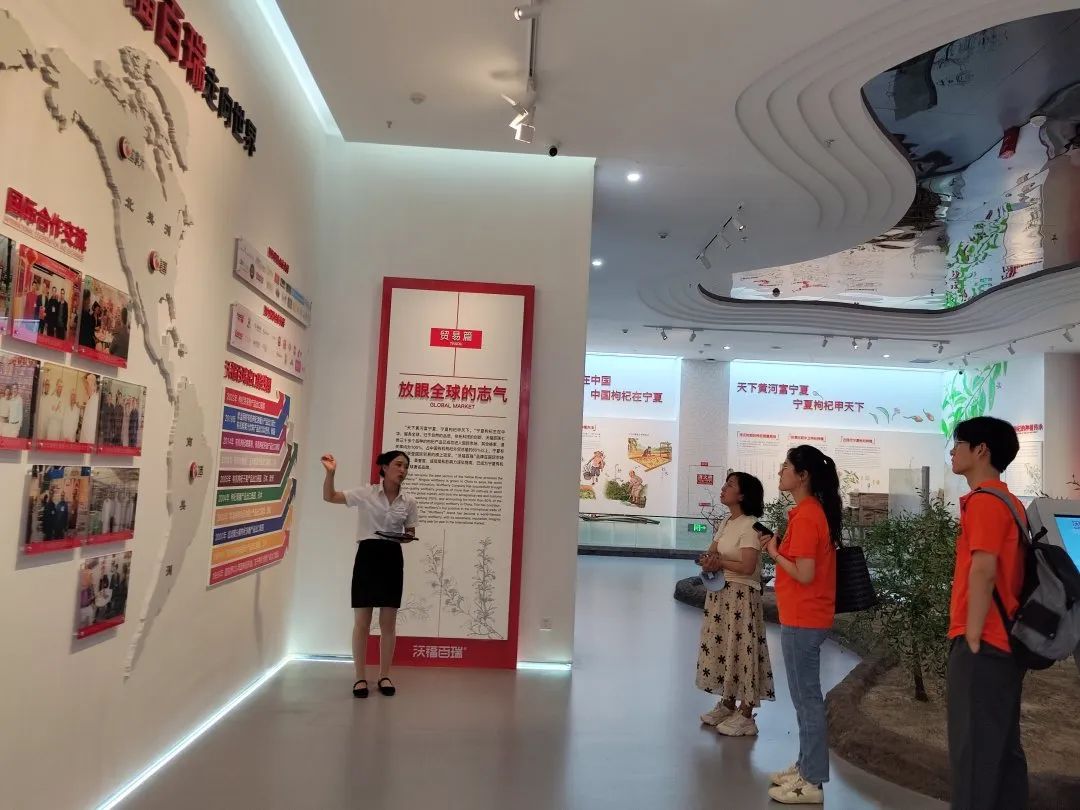 第一站,实践团来到沃福百瑞枸杞产业股份有限公司,对宁夏枸杞的整体现状进行深入了解。在其2022年建成使用的枸杞展馆中,实践团成员对于宁夏枸杞的历史文化、地域特色、科技创新、商业贸易等有了深入的了解。