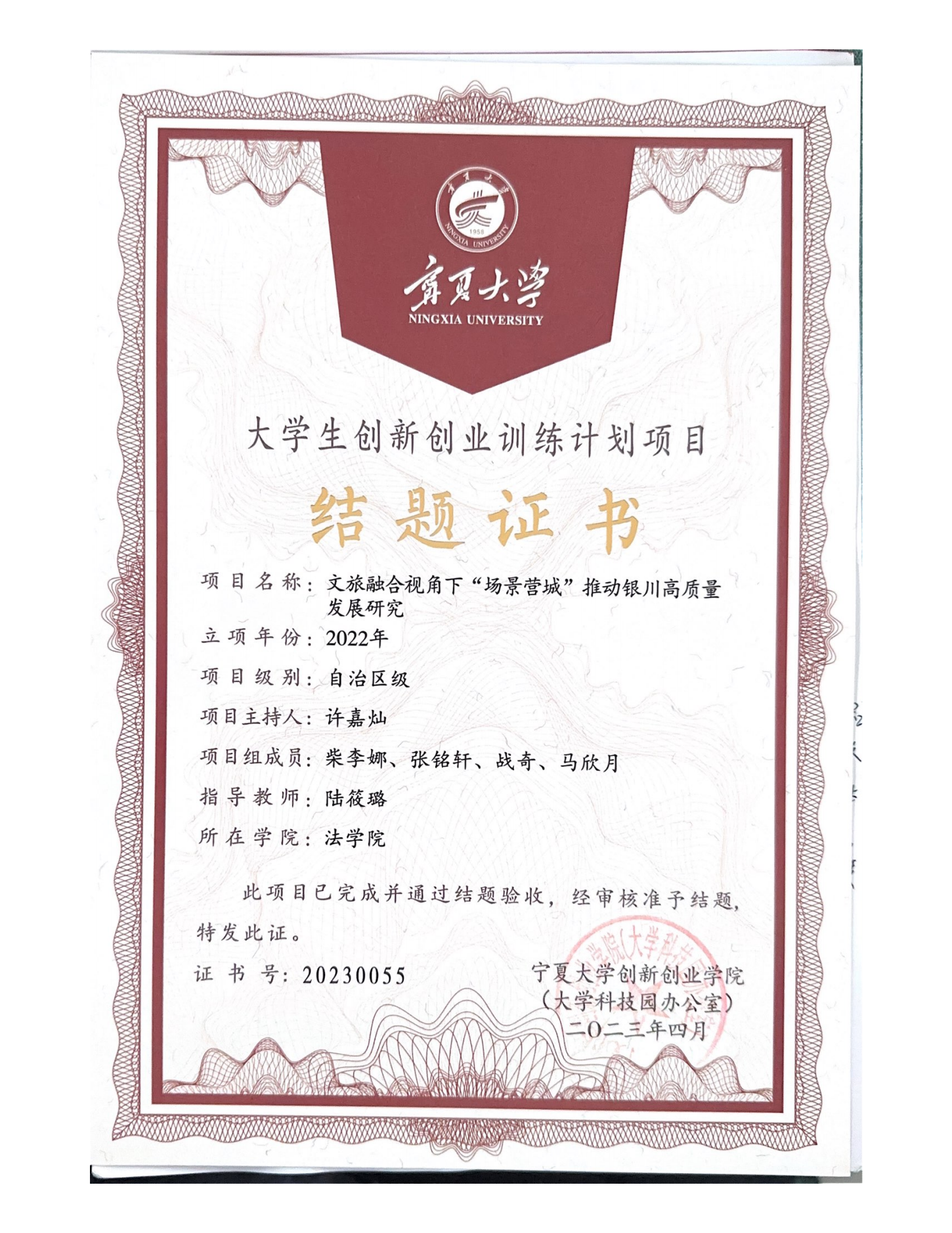 主持完成1项自治区级大学生创新创业项目,作为成员参与完成1项自治区级、2项校级大学生创新创业项目。作为核心成员两次参加“互联网+”大学生创新创业大赛并分别获得国家级铜奖和宁夏赛区金奖。获得“挑战杯”大学生创业计划校级二等奖2次,校级一等奖1次。