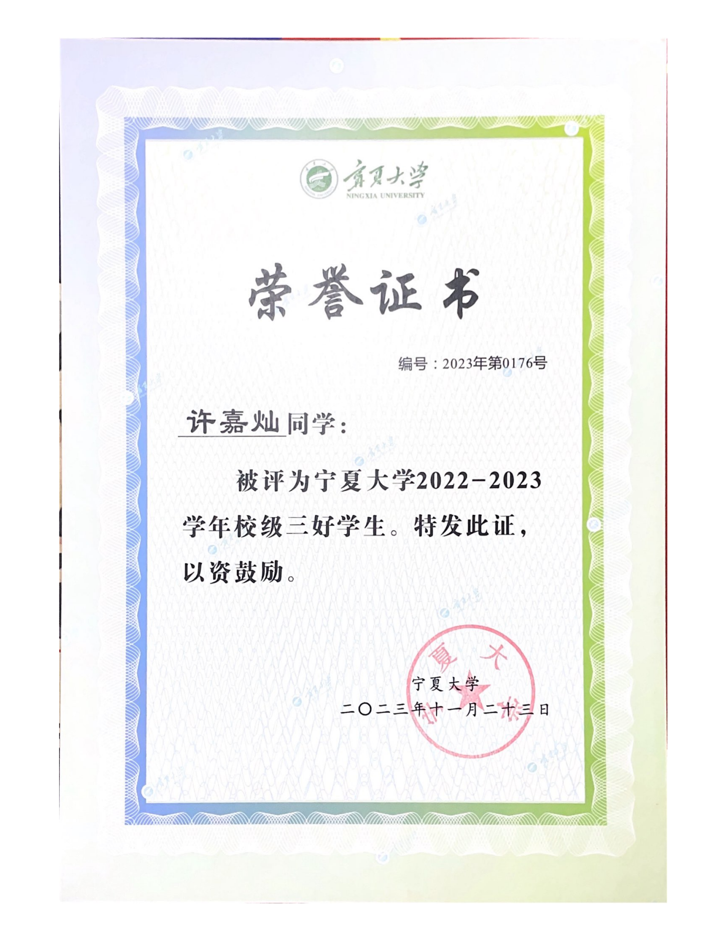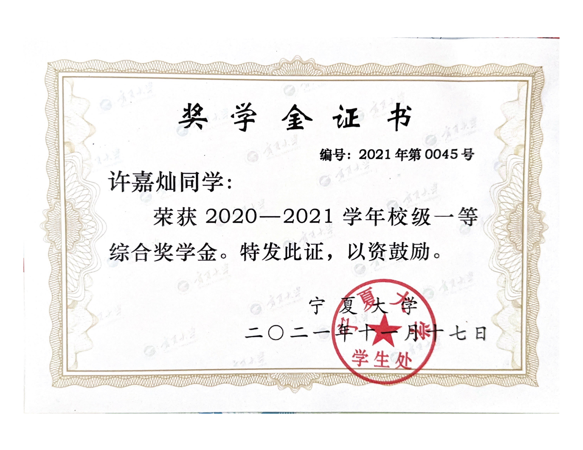 前四学年专业排名、综合测评排名均位列班级第一,连续四年获得校级一等综合奖学金,并获校级三好学生、优秀共青团员、创新创业奖等荣誉称号。一次性通过大学生英语四六级考试,其中四级551分,六级527分。