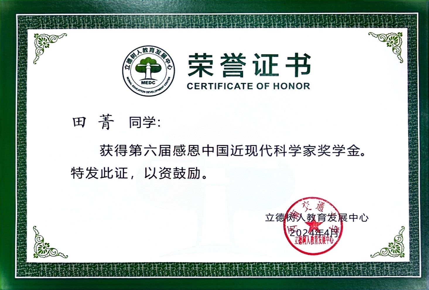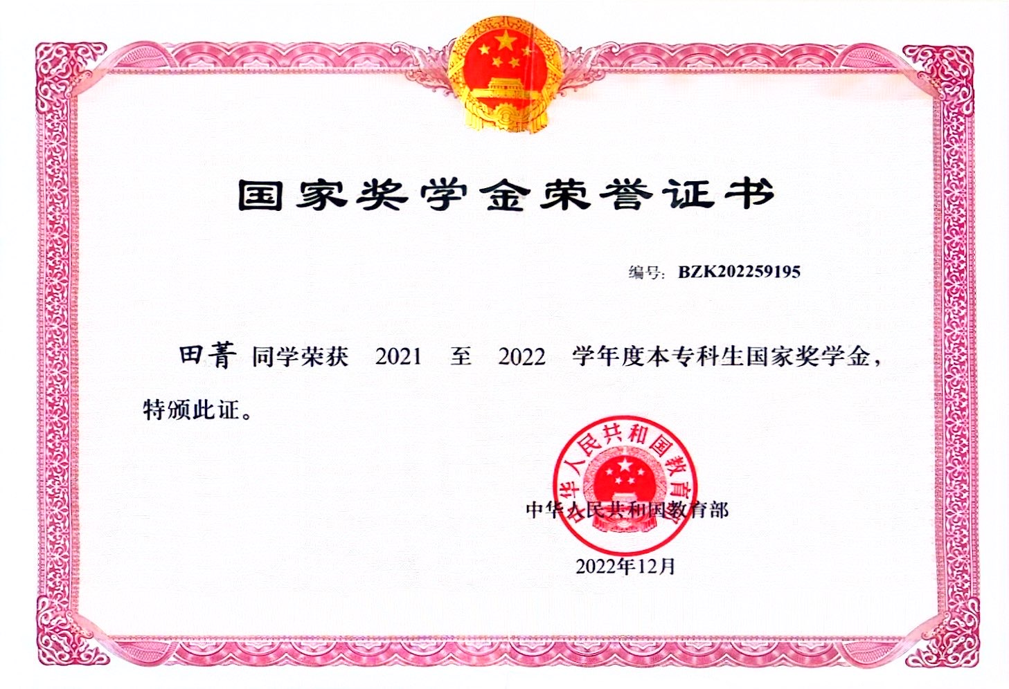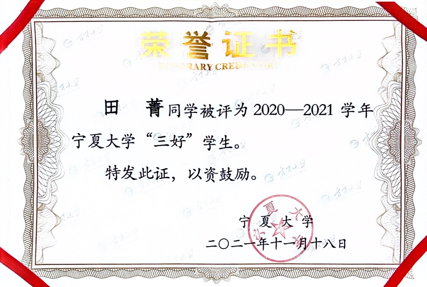 大学四年一直潜心学业、刻苦钻研,追求卓越。保持专业第一的同时,获第六届感恩中国近现代科学家奖学金、2021—2022年国家奖学金、2021年“外研社·国才杯”全国英语阅读大赛宁夏赛区二等奖、2022年全国大学生英语竞赛三等奖、宁夏第九届大学生数学建模竞赛二等奖、2022年“挑战杯”全区大学生创业计划竞赛银奖、宁夏大学三好学生、校级一等奖学金、宁夏大学第八届“互联网+”大学生创新创业大赛银奖以及宁夏大学第二届企业资源计划模拟经营大赛三等奖、宁夏大学第十四届挑战杯大学生课外学术科技作品竞赛三等奖等奖项及荣誉。