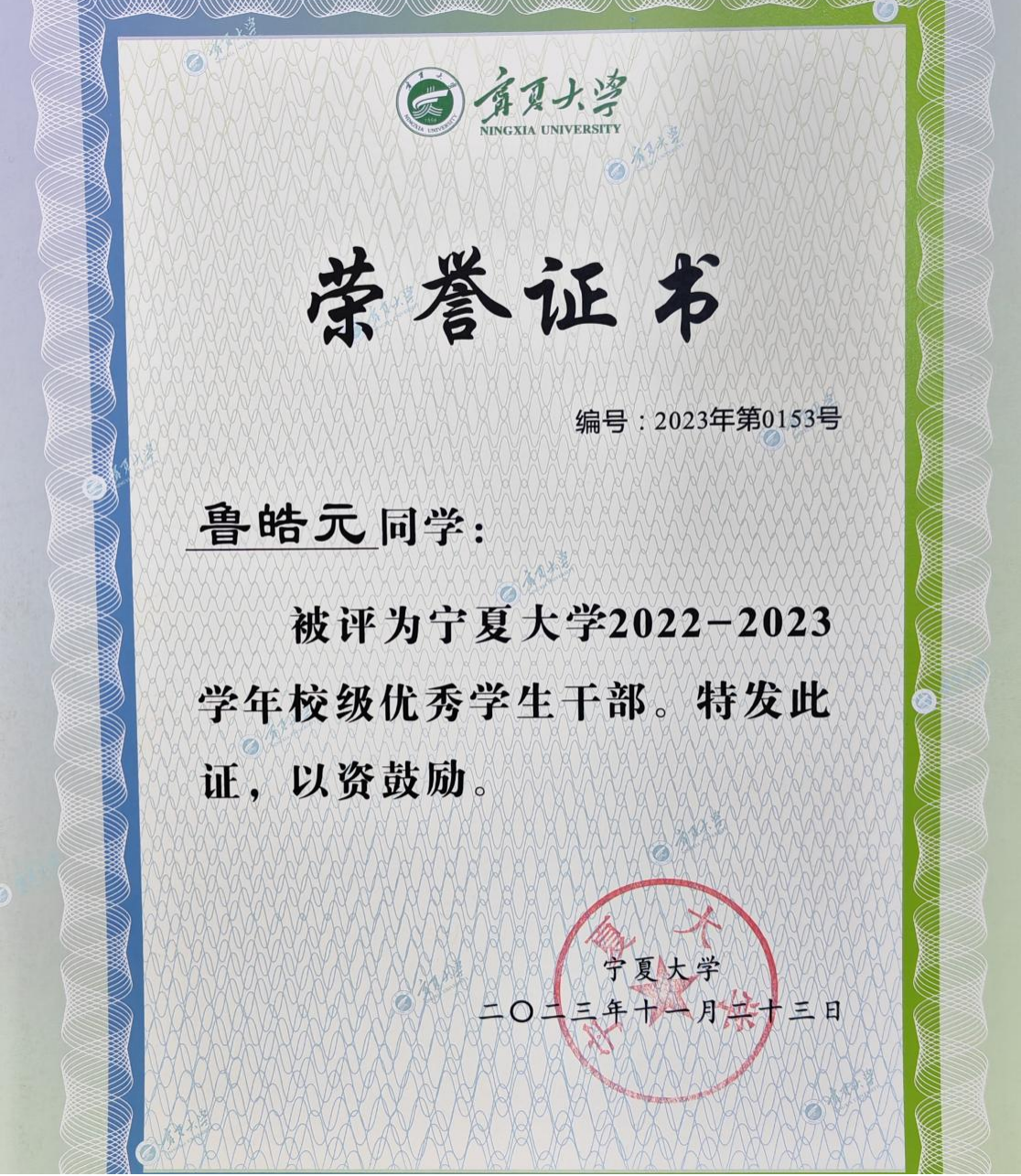 鲁皓元,男,汉族,河南平顶山人,中共党员,经济管理学院2020级经济学(金融)专业本科生,现已推免至宁夏大学。