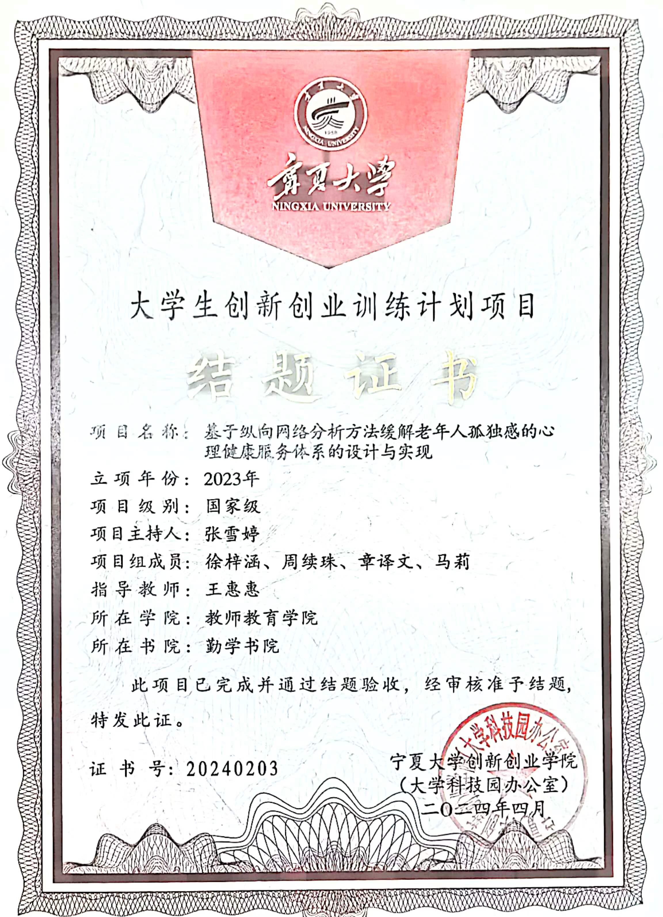 在校期间,曾获国家奖学金(入选2021—2022学年度本专科生国家奖学金获奖学生代表名录)、感恩中国近现代科学家奖学金、宝钢优秀学生奖和宁夏回族自治区大学生年度人物,先后被人民日报、宁夏教育厅、青春宁夏等媒体报道。