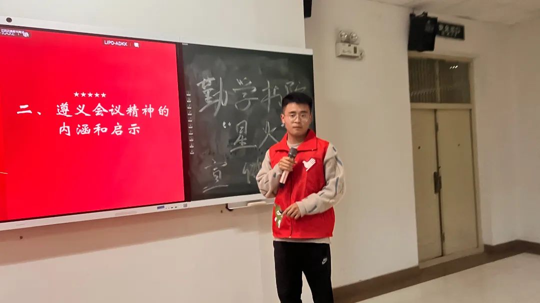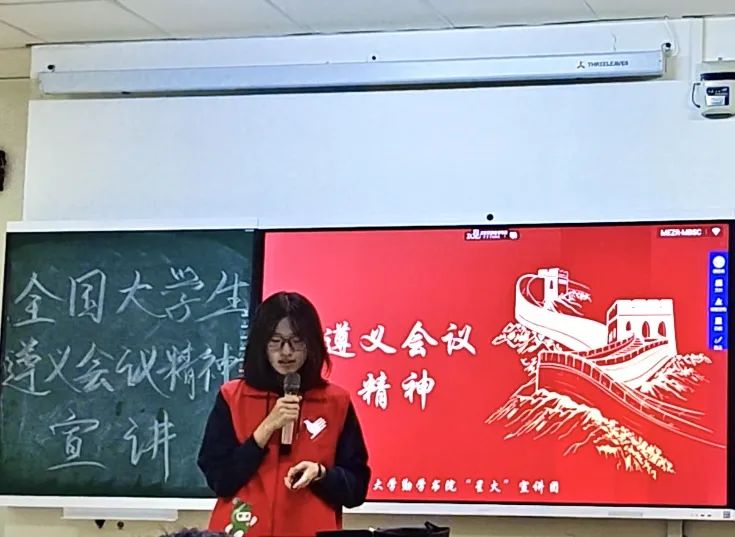 宣讲会上,宣讲员贾硕予通过问题导向,以“怎么革命,怎么能革命,怎么深入革命”三大问题生动引入主题。其后以问题为线索,贾硕予向全体同学展现了遵义会议的过程和历史意义。其后,宣讲员马兵对遵义会议精神的内涵和启示,新时代如何弘扬遵义会议精神,走好新的长征路三大主题进行细致的阐释。