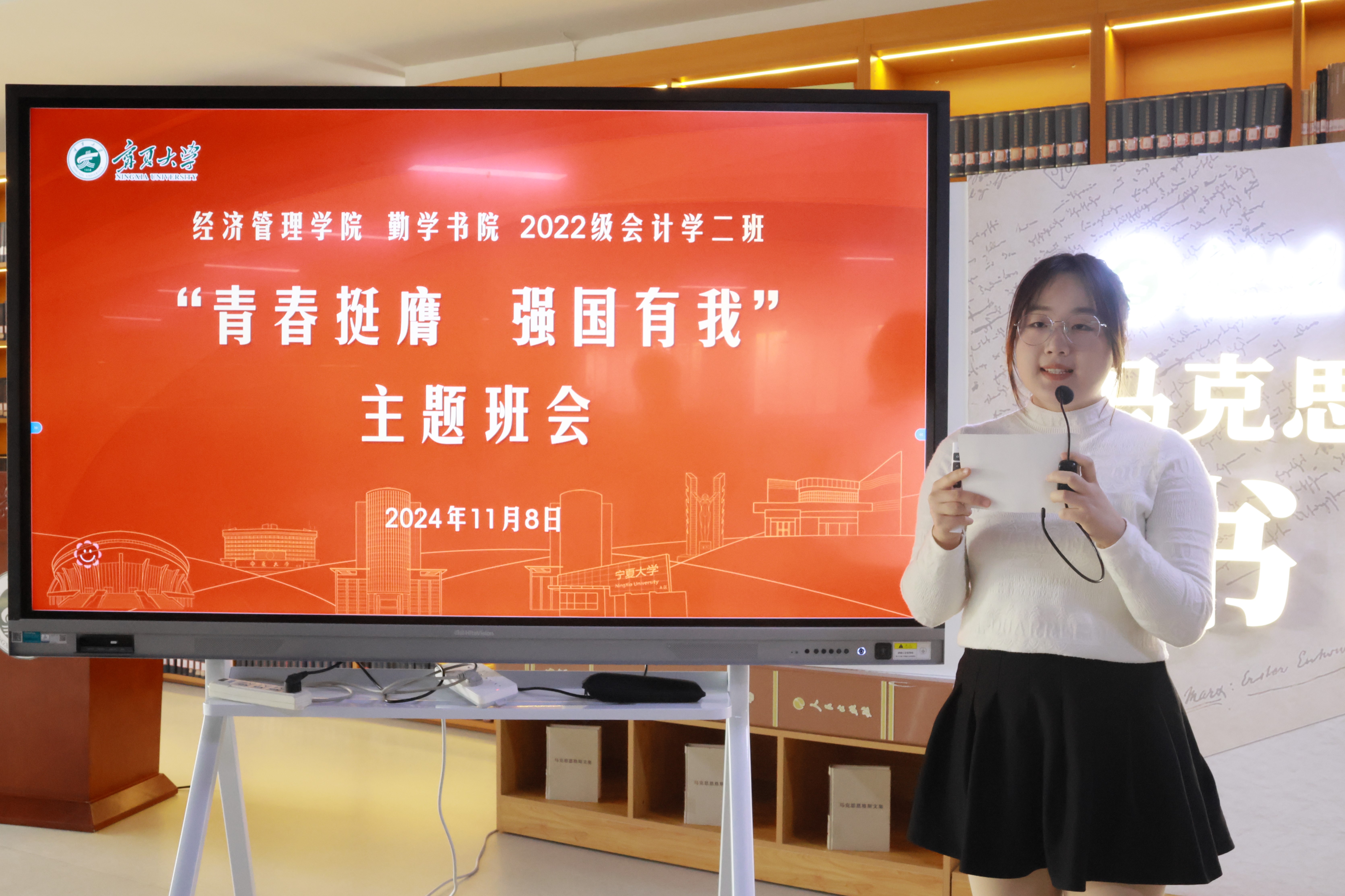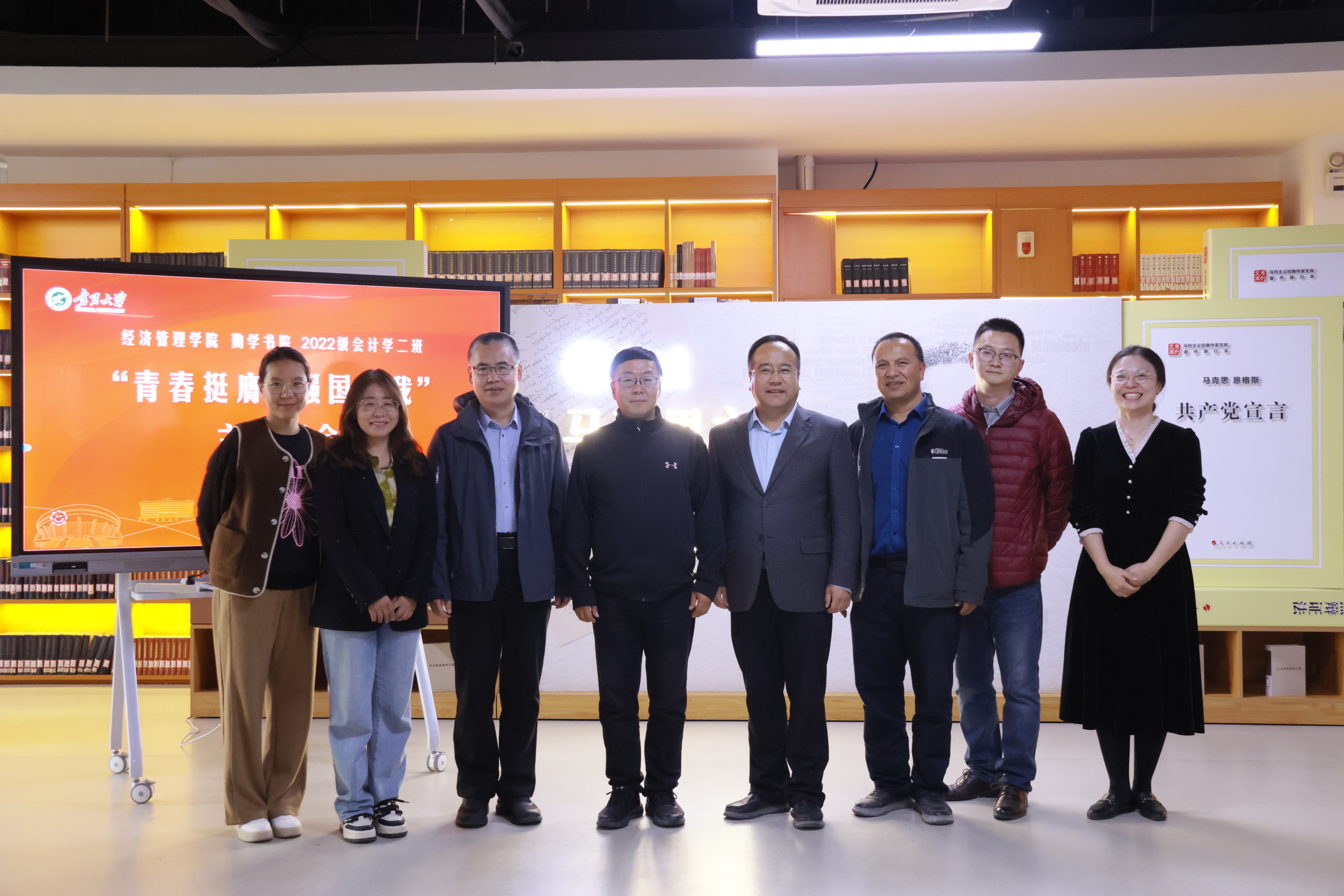 11 月 8 日下午,校党委常委、副校长黄河参加了经济管理学院 2022 级会计学2班在宁夏大学马克思主义书房举办的“青春挺膺,强国有我”主题班会。班会由班主任董晓芳主持。