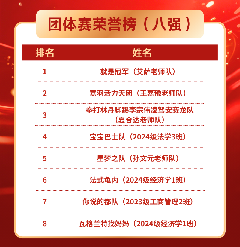 经过激烈角逐,6月5日下午,各奖项尘埃落定。“就是冠军队”凭借出色的团队配合摘得团体桂冠,“嘉羽活力天团队”和“拳打林丹脚踢李宗伟凌驾安赛龙队”分获亚军和季军。个人单打方面,2022级会计AD专业的李凌锐与2023级会计专业的刘嘉瑶分别获得男女单打冠军。