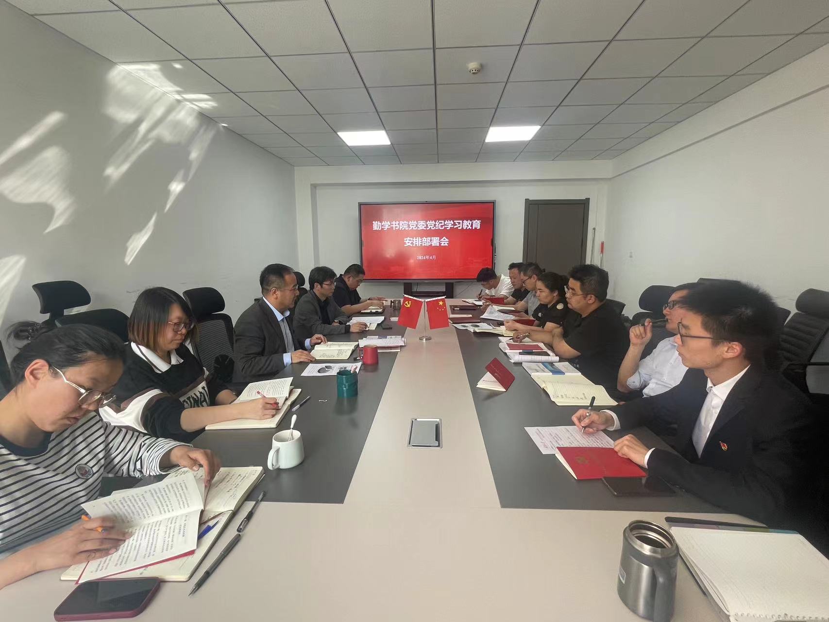 4月25日,勤学书院在201会议室召开党纪学习教育启动部署会,书院党委书记、院长马瑜,党委副书记杨扬,副院长常江、王巳卉,各党支部书记参加会议。会议由党委副书记靳永雄主持。