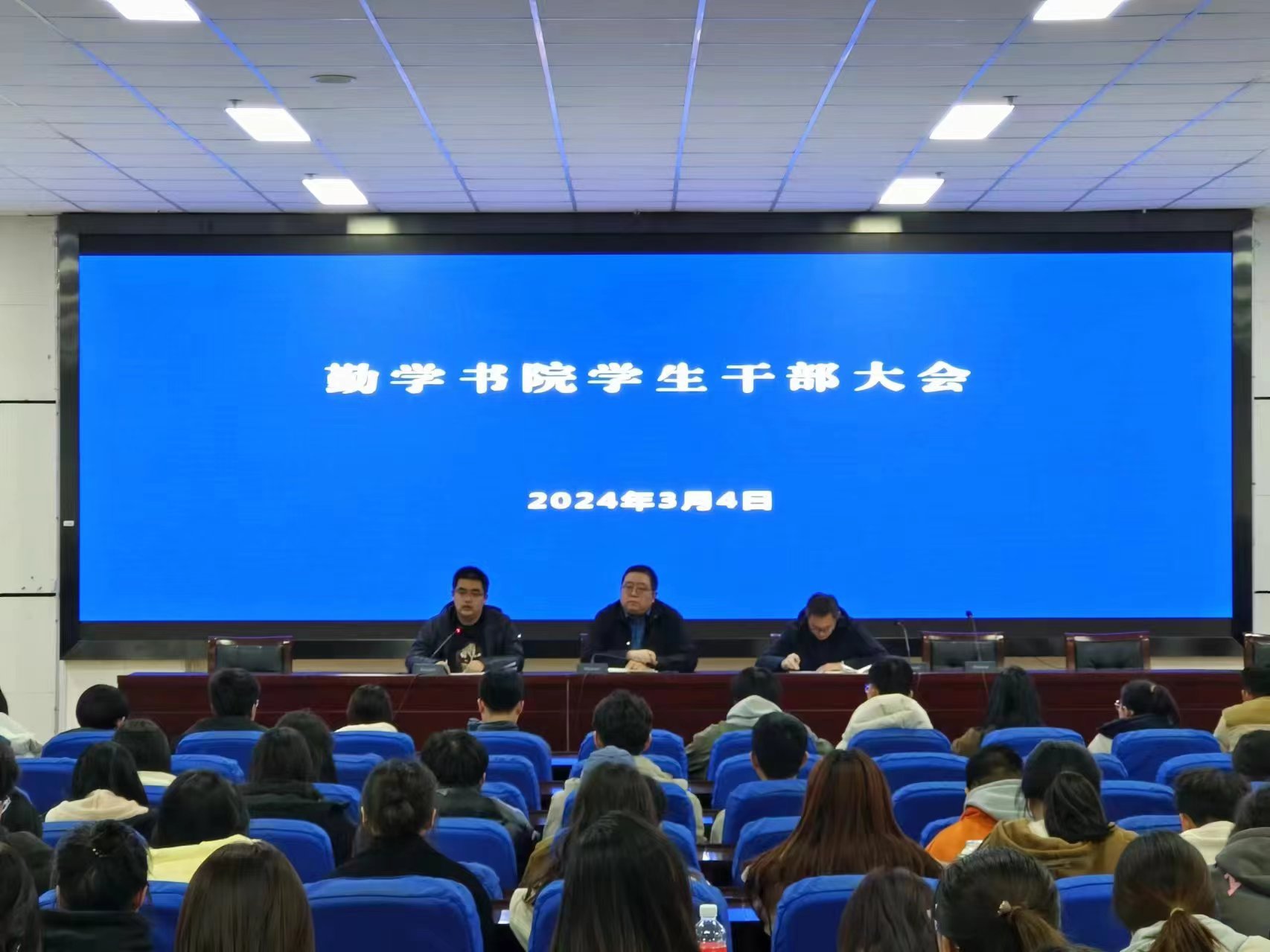 2024-03-04春暖花开,万象更新。为加强学生干部队伍建设,推进新学期学生工作平稳有序进行。3月4日下午,勤学书院于文荟楼东报告厅召开本学期学生干部大会。勤学书院副院长常江、辅导员贺剑、孙文元和本科生各班班委参加会议。会议伊始,孙文元围绕校园安全意识提升,风险隐患防范和学生公寓文明建设做了相关要求。贺剑介绍了《教育与社会学部勤学书院本科生课堂师生共同考勤办法》的相关要求,提出要将考勤办法作为涵养书院优良学风的制度保障。常江指出了前期学生工作中存在的不足,并对新学期全体学生干部提出了要求,他强调,全体同学应严格遵守校纪校规,加强自我管理,提升安全意识,持续做好课堂学风建设和宿舍文明建设,认真学习,积极开展学业、职业生涯规划,努力提高自身综合素质,为新学期的成长打下良好的基础,起到模范带头作用,引领书院全体学生共同营造良好的学习生活氛围